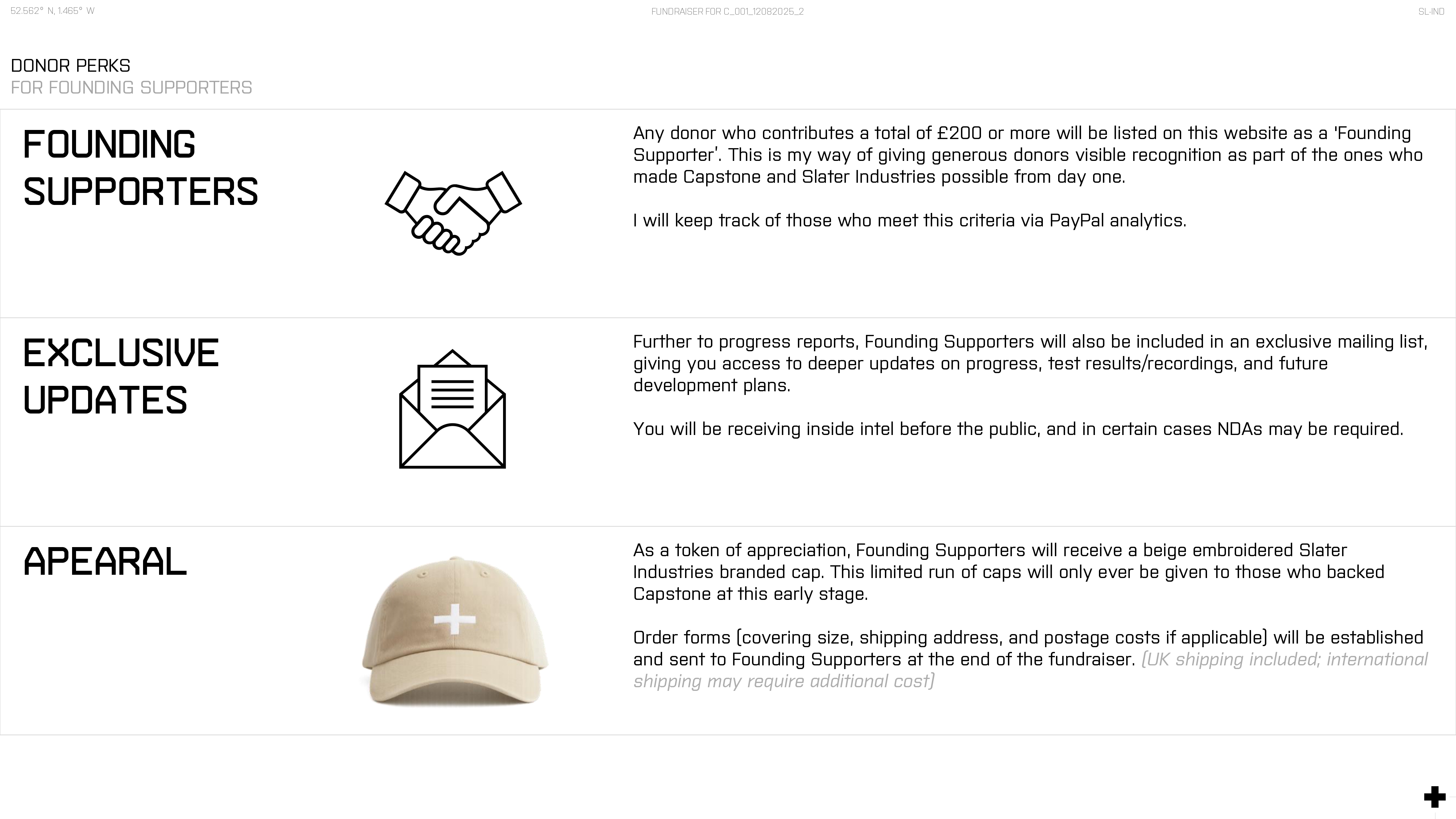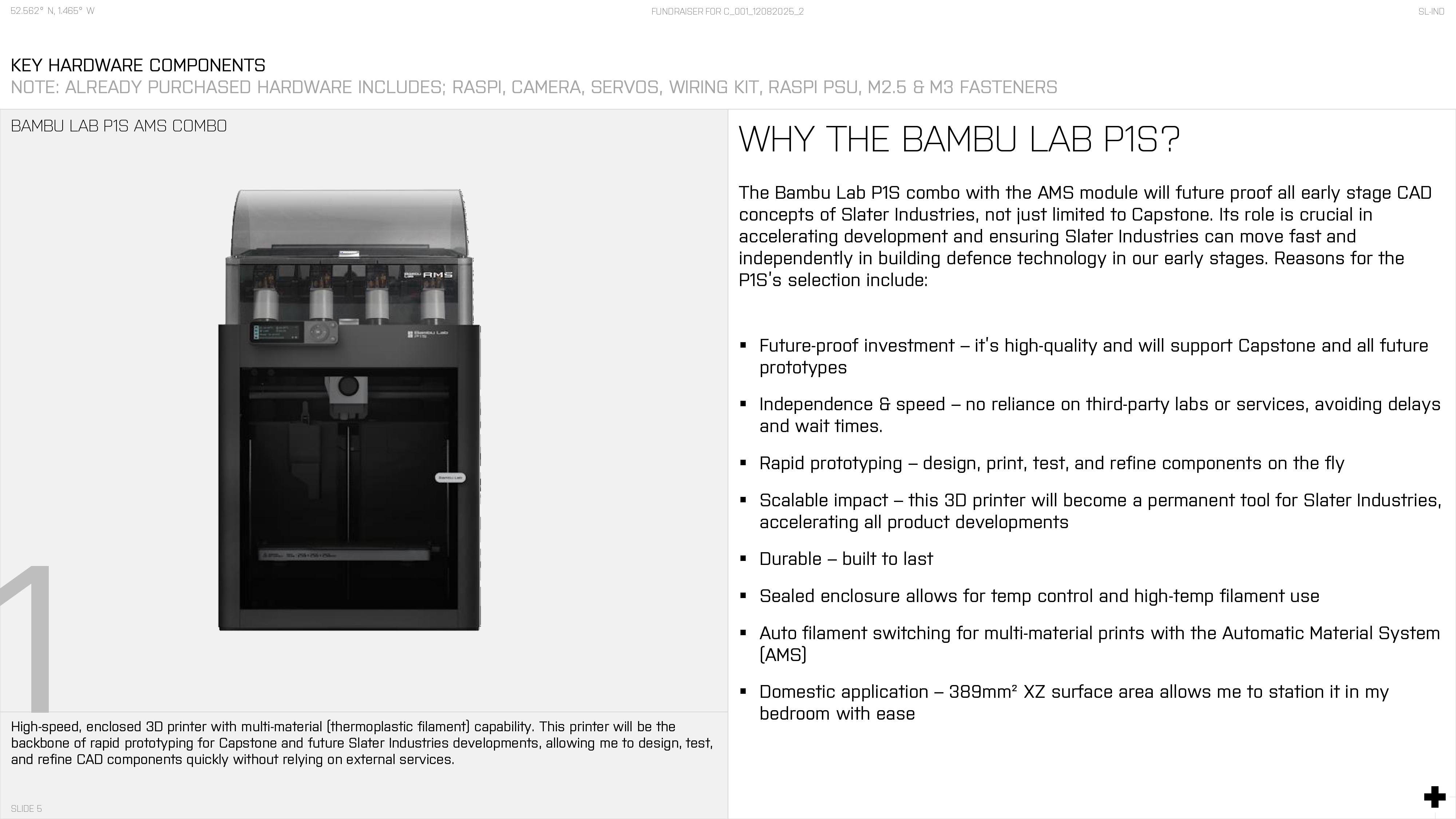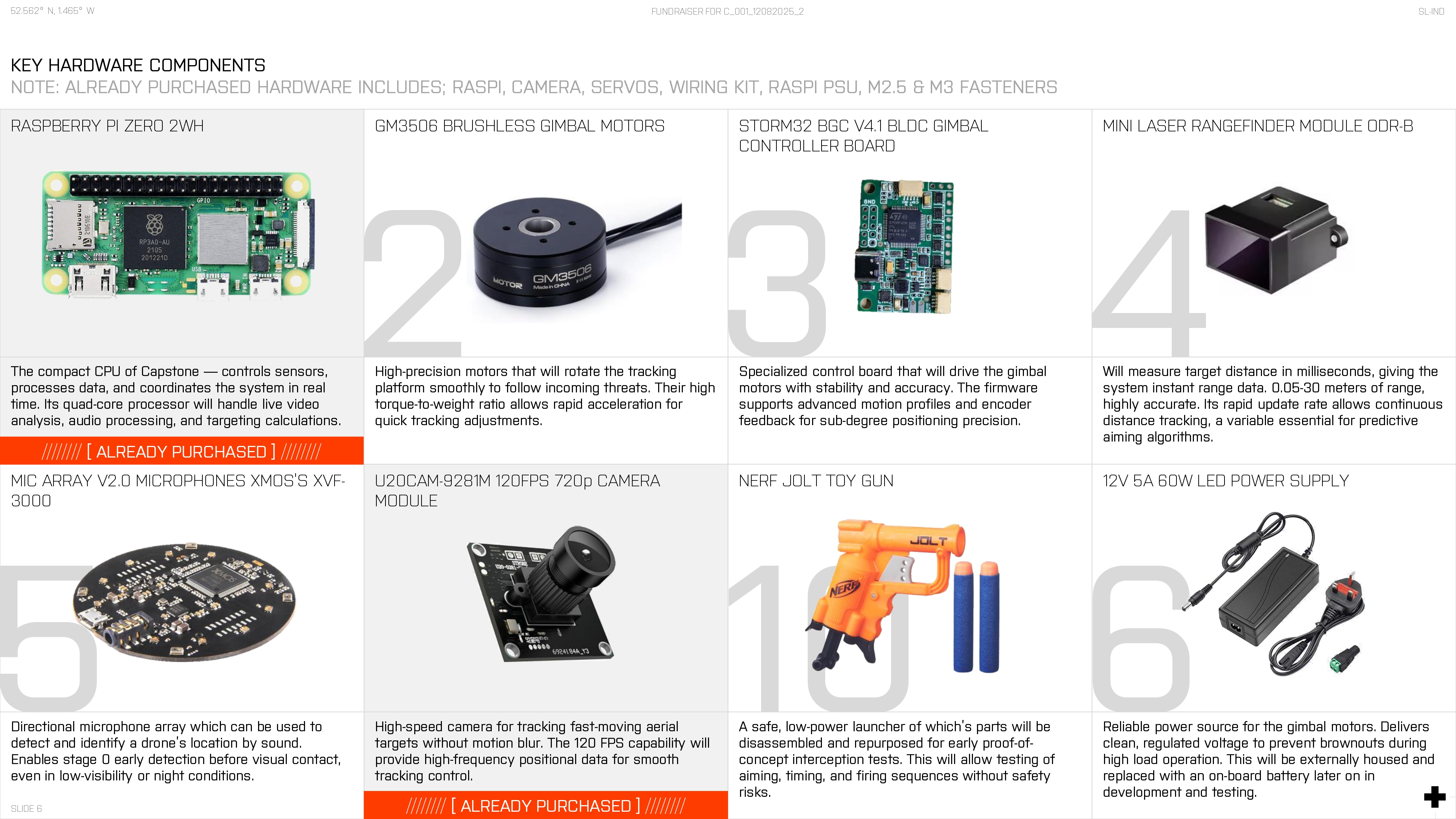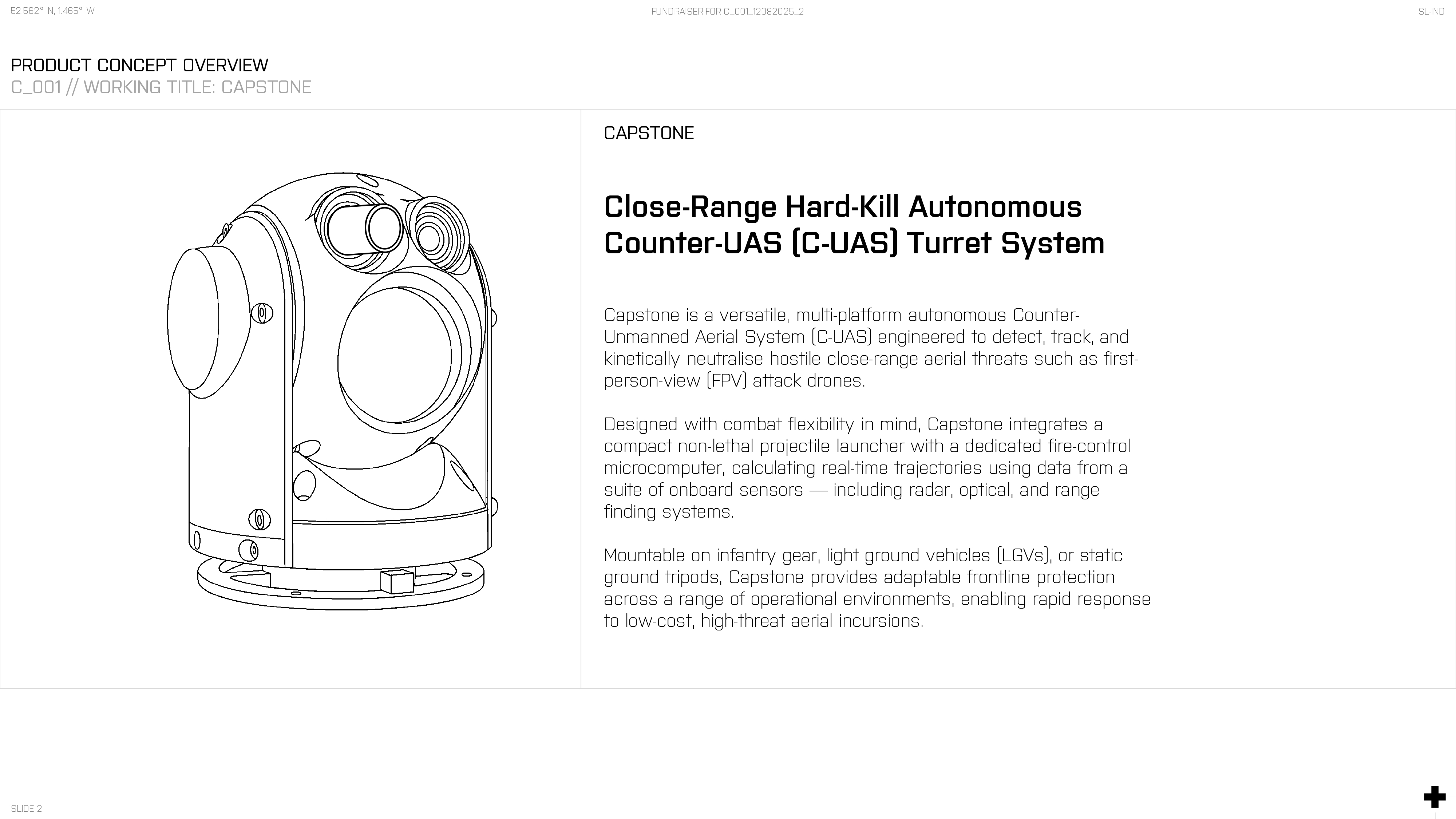 I'm looking into the future of Slater Industries with this fundraiser. The same equipment will fuel future iterations of Capstone as well as future technologies developed by Slater Industries. Every pound takes us one step closer to building a system that could one day stop a drone from harming people, and developing other dual-use defence systems.