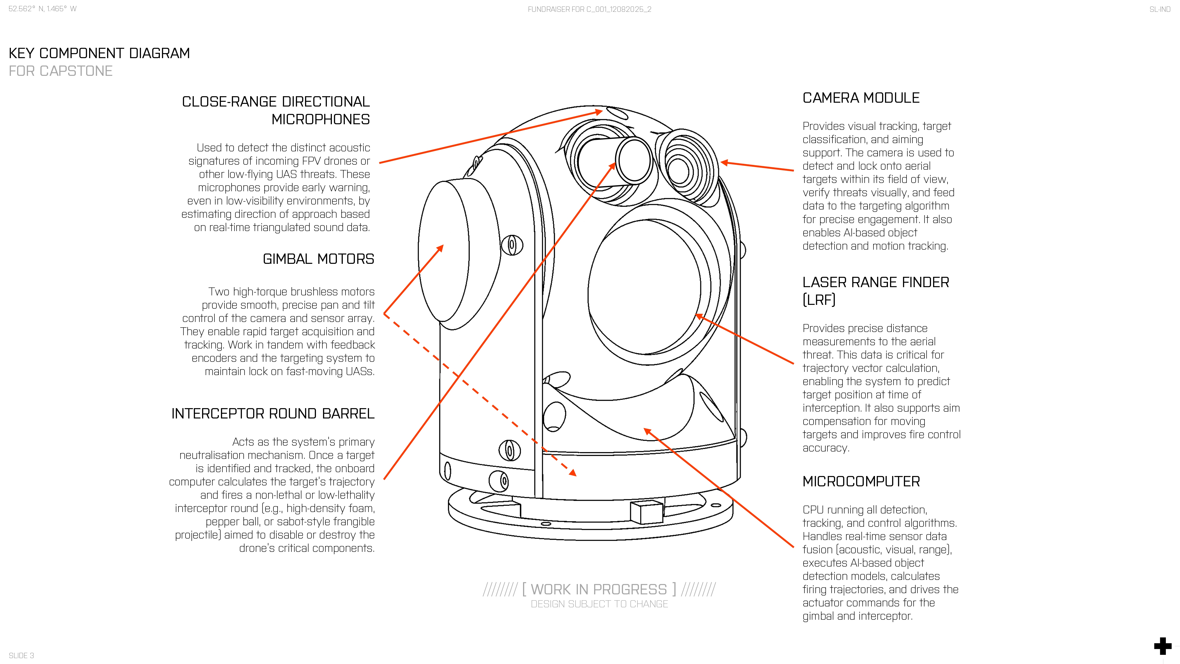 Capstone is a portable, dual-use anti-drone turret system designed to detect, track, and kinetically neutralise close-range aerial threats such as FPV attack drones and other small UASs. See below for a detailed diagram of key components in Capstone.