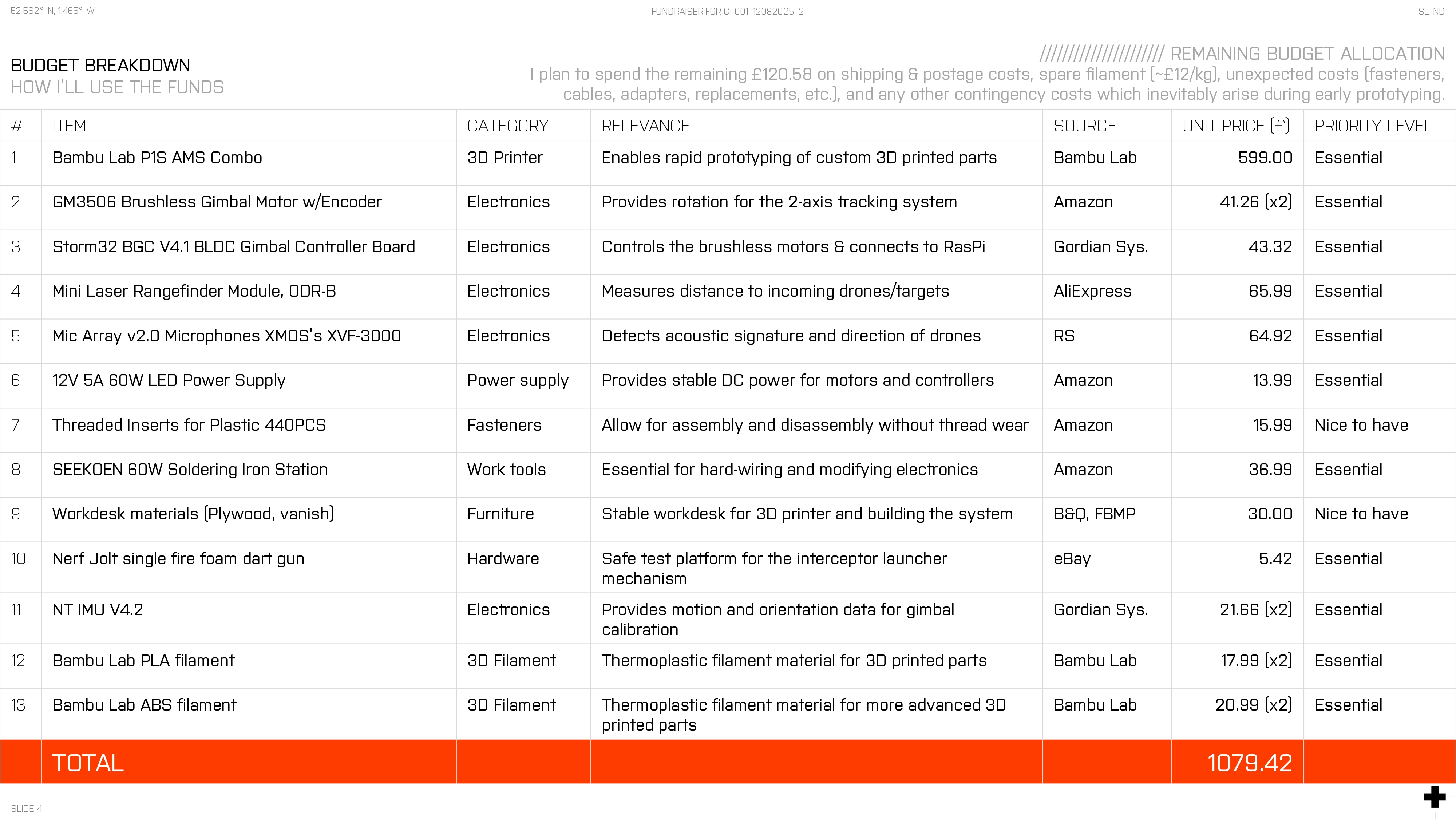 With just £1,200, I can source the 3D printer, gimbal motors, microcomputing hardware, sensor systems, and other equipment needed to bring Capstone from concept to reality. See my detailed budget breakdown below, and access the spreadsheet via this link.