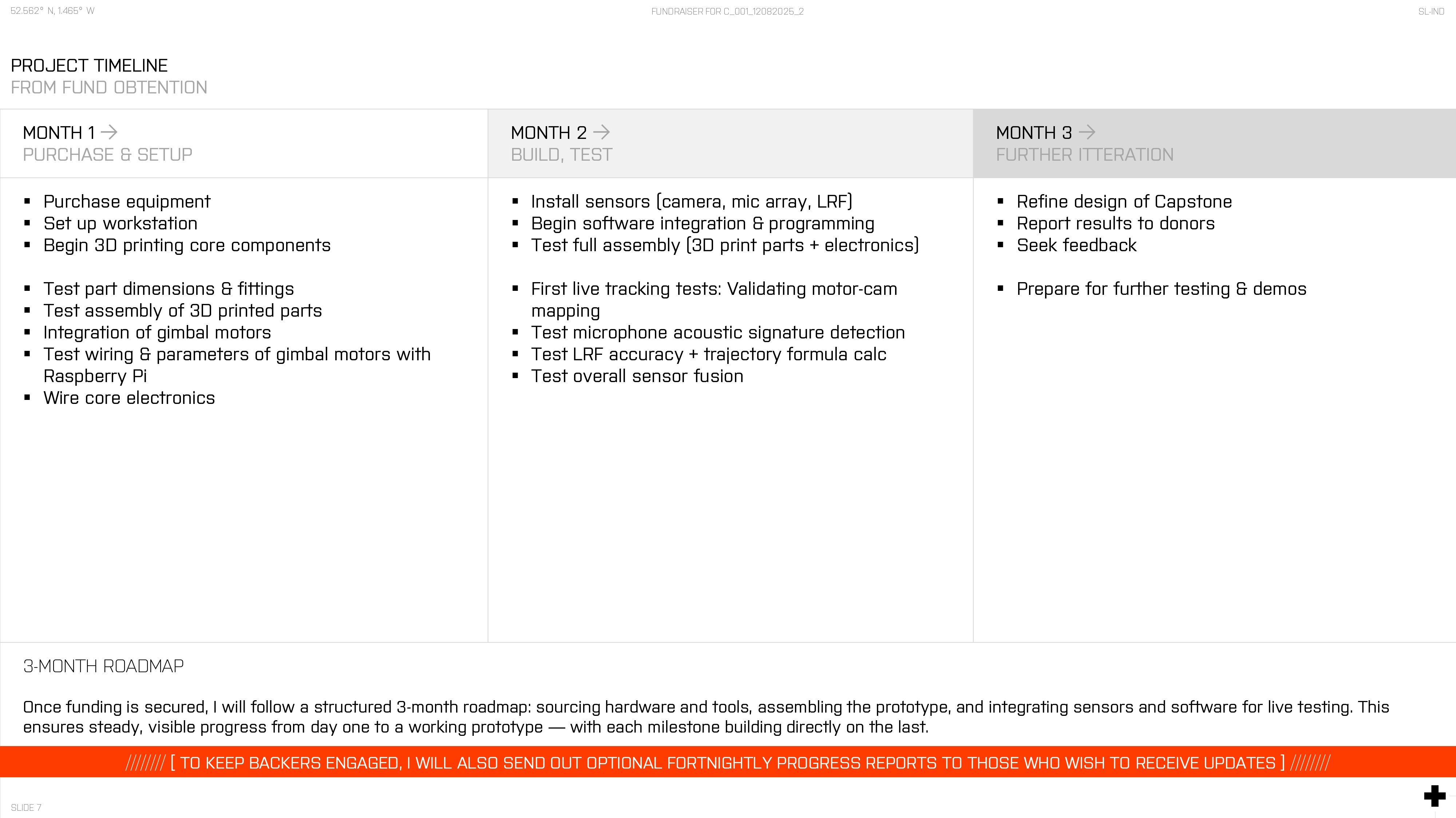 From when I receive the funds, I plan to follow a monthly month roadmap: sourcing hardware and tools, assembling the prototype, and integrating sensors and software for live testing. This ensures steady, visible progress from day one to a working prototype - with each milestone building directly on the last. Backers who opt-in can receive fortnightly progress reports. See below for the project timeline.